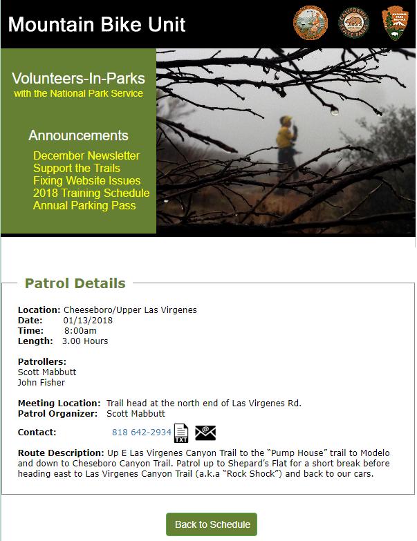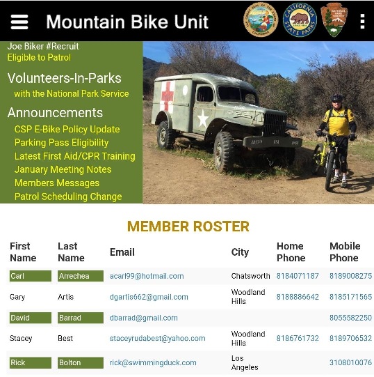 You must contact the Patrol Organizer before the scheduled patrol time if you would like to ride along with the MBU patrollers. If you are using your mobile device, click on the phone number, text icon, or email icon to contact the patrol organizer. If you are using a stationary desktop/laptop computer, the patrol organizer contact information is available in the membership roster. |
